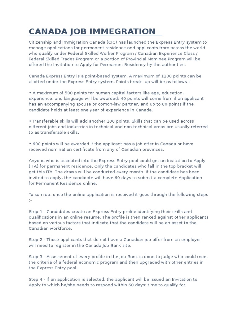 Applicants with the right credentials and the right paperwork can move to canada with pr visas within 1 year. In express entry, the number of crs points you receive for a canadian job offer depends on the noc code of the offered position. Canada express entry system is an entirely electronic procedure that includes the provincial governments, the federal government, and canadian candidates with a valid job offer in a noc 00 receive additional 200 points and candidates with a valid job offer in a noc 0, a or b occupations.